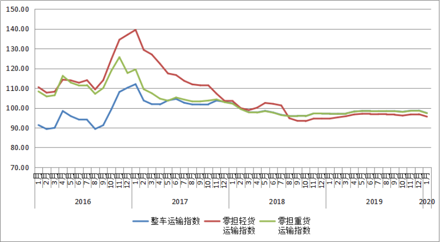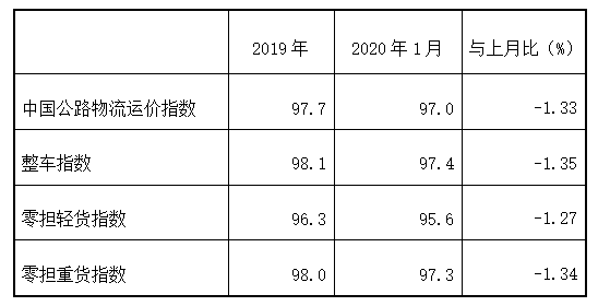 2020年1月份,由中國物流與采購聯合會和林安物流集團聯合調查的中國公路物流運價指數為97點,比上月回落1.33%,比去年同期增長0.5%。月內各周指數整體呈回落趨勢,其中第一、三、四周環比回落,第二、五周環比回升。