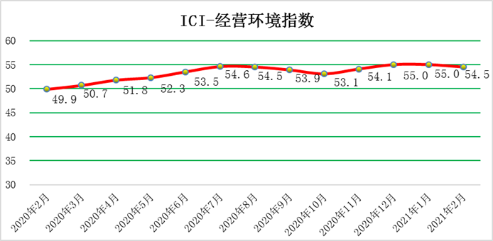 2021年2月份,中國工業綜合指數(以下簡稱ICI)為58.4%,環比下降0.2個百分點,受春節效應影響小幅回落,自去年4月份以來連續位于榮枯線以上,表明中國工業經濟總體持續恢復。生產狀況指數為66.7%,環比上漲1.3個百分點,繼續保持高位,企業生產活動積極平穩進行。效益狀況指數為52.5%,環比下降0.5個百分點,小幅回落。經營環境指數為54.5 %,環比回落0.5個百分點,在保持較高位的基礎上連續位于榮枯線之上,反映了市場經營環境持續改善。融資難易指數為47.2%,環比下降1.0個百分點,持續位于榮枯線下方,且該指數仍低于50%的均衡線,表明當前企業融資難融資貴的問題持續存在,針對此難題還需更有效的貨幣、財政政策等。預期發展指數為59.6 %,環比下降1.8個百分點,有所回落但持續位于榮枯線以上,該指數依舊長期保持高位優勢。ICI制造業指數為60.1 %,環比回落0.3個百分點,但處于高位,自去年4月份以來連續位于榮枯線以上,表明制造業總體持續回暖。