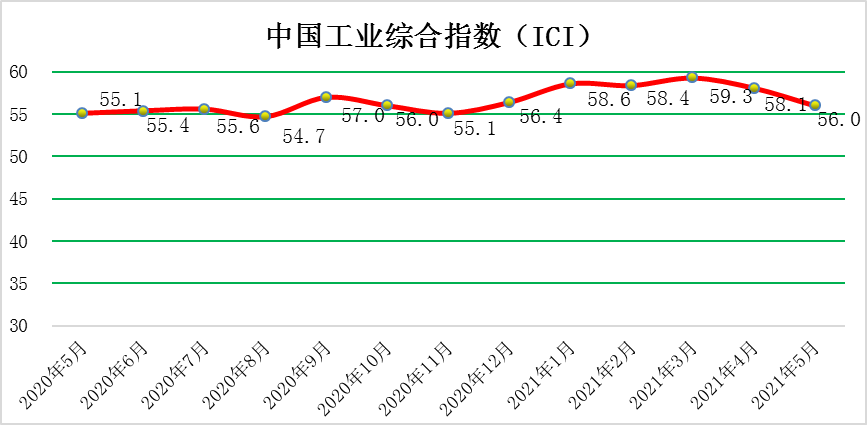 2021年5月份,中國工業綜合指數(以下簡稱ICI)為56.0%,環比回落2.1個百分點,有所回落,但自去年4月份以來連續位于榮枯線以上,表明中國工業經濟總體持續恢復。生產狀況指數為65.3%,環比回落1.0個百分點,繼續保持高位,企業生產活動積極平穩進行。效益狀況指數為48.2%,環比回落3.3個百分點,跌落于榮枯線之下,處于今年最低點。經營環境指數為49.7%,環比回落5.3個百分點,跌落于榮枯線之下,經營環境出現問題。融資難易指數為40.4%,環比回落6.6個百分點,持續位于榮枯線下方,且該指數大幅下降仍低于50%的均衡線,表明當前企業融資難融資貴的問題持續存在,亟需政府進行干預、發揮作用。預期發展指數為61.2%,環比回升2.8個百分點,大幅上漲且該指數依舊長期保持高位優勢。ICI制造業指數為57.1 %,環比回落3.8個百分點,繼續處于高位,自去年4月份以來連續位于榮枯線以上,表明制造業總體持穩定復蘇。