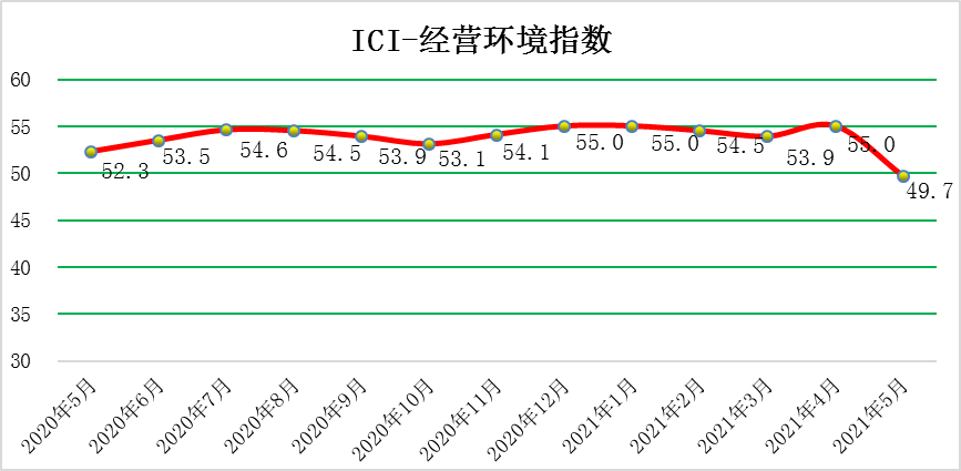 5月份,經營環境指數為49.7%,環比回落5.3個百分點,跌落于均衡線以下,經營環境出現問題,主要是因為稅負和融資問題的加劇。具體來看,稅費負擔指數為40.9%,環比下降4.3個百分點,有較大回落趨勢,連續5個月回落,連續位于榮枯線以下,稅費政策還需深化,企業目前稅負情況并不樂觀;融資難易指數為40.4%,環比回落6.6個百分點,企業融資環境長期以來處于榮枯線下方,說明當前企業融資仍需政府出臺、調整相關政策以改善;市場秩序指數58.0%,環比回落5.5個百分點,雖有所回落,但持續高于榮枯線且處高位,市場秩序持續改善。