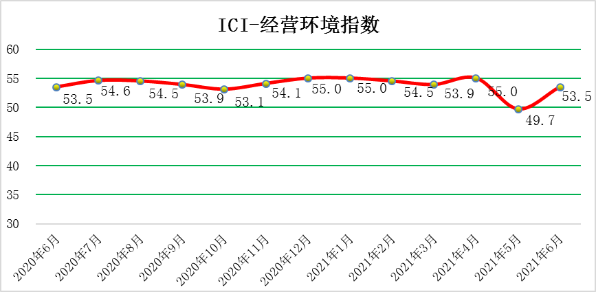 6月份,經營環境指數為53.5%,環比回升3.8個百分點,回到榮枯線之上,經營環境改善,稅負和融資問題有所改善。具體來看,稅費負擔指數為46.8%,環比回升5.7個百分點,停止連續回落的走勢,但仍位于榮枯線以下,稅費政策還需深化,企業目前稅負情況并不樂觀;融資難易指數為47.4%,環比回升7.0個百分點,環比有較大回升,但企業融資難易度指數長期以來處于榮枯線下方,說明當前企業融資仍需政府出臺、調整相關政策以改善;市場秩序指數63.5%,環比回升4.5個百分點,持續高于榮枯線且處高位,市場秩序持續改善。