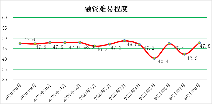8月份,經營環境指數為52.0%,環比回升3.3個百分點,回升于榮枯線之上,經營環境并不穩定,稅負和融資問題有所改善。具體來看,稅費負擔指數為48.1%,環比回升9.1個百分點,得到極大改善,但仍位于榮枯線以下,稅費政策還需深化;融資難易指數為47.8%,環比回升5.5個百分點,企業融資難易度指數長期以來處于榮枯線下方,說明當前企業融資仍需政府出臺、調整相關政策以改善;市場秩序指數58.2%,環比回落1.0個百分點,持續高于榮枯線且處于高位,市場秩序持續改善。