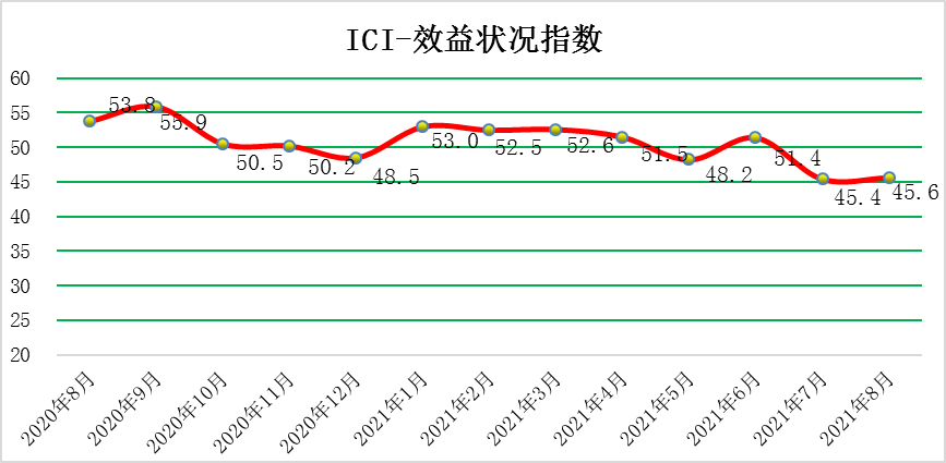 8月份效益狀況指數為45.6%,環比回升0.2個百分點,繼續位于榮枯線之下,效益狀況延續收窄態勢,成本負擔基本不變。具體來看,利潤指數為58.3%,環比回落0.5個百分點,企業盈利情況持續向好;成本指數為24.7%,環比回升6.4個百分點,企業在成本方面的負擔依舊嚴重但有所改善,原材料價格等因素值得關注;產成品庫存指數為45.1%,環比回落3.6個百分點,繼續位于于榮枯線之下,需求小于生產,產品庫存增加。凈資產回報率指數為57.8%,環比回升0.1個百分點,繼續位于榮枯線之上,企業凈資產持續改善。