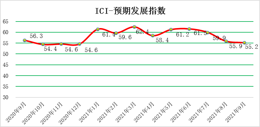 9月份ICI制造業指數為53.0%,環比回升0.4個百分點,持續高于榮枯線。9月份,中國制造業采購經理指數(PMI)為49.6%,低于上月0.5個百分點,降至臨界點以下,制造業景氣水平有所回落。9月份ICI制造業指數和PMI一上一下,主要是二者樣本差異性,行業分布不同的原因。