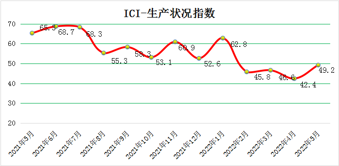 5月份ICI制造業指數為47.7%,環比回升3.8個百分點,繼續位于榮枯線之下。