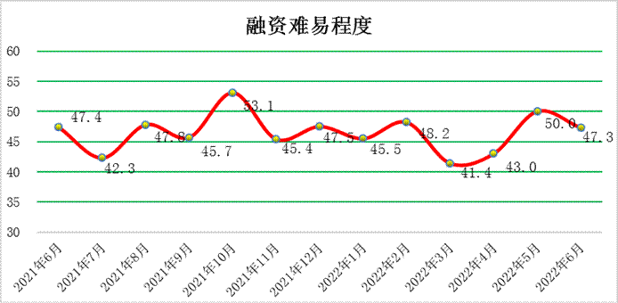 6月份,經營環境指數為51.5%,環比回升3.6個百分點,回升至榮枯線之上,經營環境問題有所改善。具體來看,稅費負擔指數為46.8%,環比回升1.0個百分點,持續位于榮枯線指下,稅費政策還需深化;融資難易指數為47.3%,環比回落2.7個百分點,跌至榮枯線之下,說明當前政府相關政策還需持續深化、加強鞏固、靈活調整;應收賬款指數為50.5%,環比回升10.6個百分點,較大回升,重回榮枯線之上,應收賬款問題短期內得到改善。市場秩序指數61.2%,環比回升0.1個百分點,持續高于榮枯線且處于高位,市場秩序持續改善。