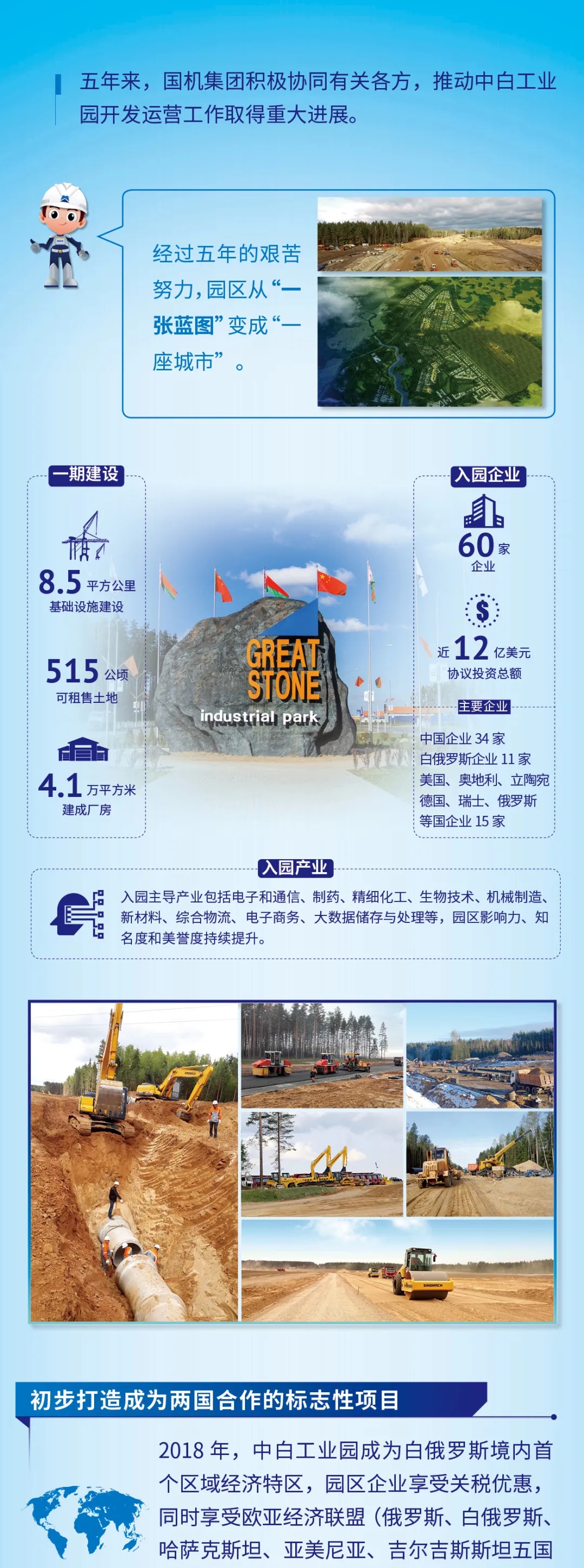 5年后的今天,中白工業園已邁入開發和運營并舉的關鍵階段,入園企業達60家,協議投資總額近12億美元。接下來,一圖帶您詳細了解中白工業園的新進展。