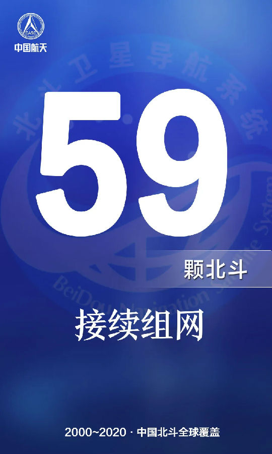 2020年6月23日,中國北斗衛星導航系統全球組網階段收官星發射圓滿成功。20年來,中國航天科技集團有限公司成功發射了59顆北斗衛星(4顆北斗試驗導航衛星、55顆北斗導航衛星),在太空布局中國導航星座。