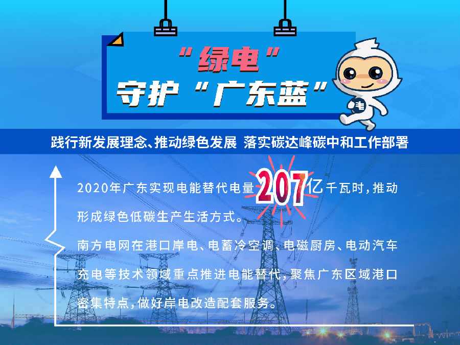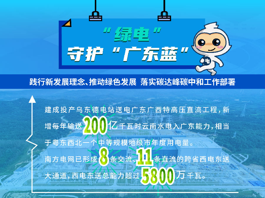 2020年廣東空氣質量持續改善,主要污染物連續六年達標。南方電網公司通過建設堅強電網、加大西電清潔能源輸送、引導社會科學用電等措施,讓綠色清潔能源有力支援實現“廣東藍”。2020年,廣東接收西電連續9年維持正增長,建成烏東德送電廣東特高壓柔性直流示范工程,推進電能替代,加快風電、光伏等清潔能源接入,在最高負荷12687萬千瓦、全年用電量持續增長的情況,以綠色電力守護廣東碧水藍天。一組圖帶你認識“綠電”如何守護“廣東藍”。