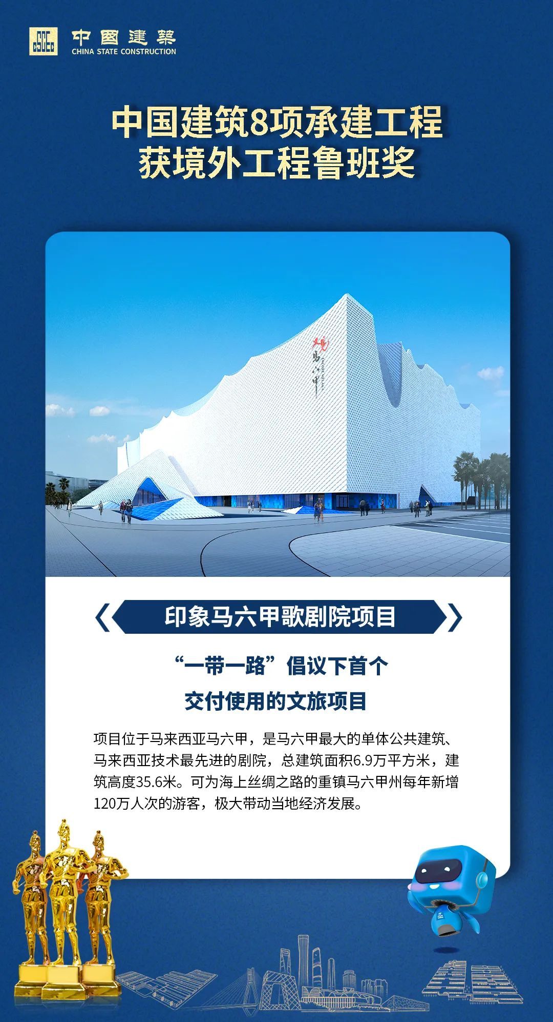 近日,中國建筑業協會公布了2020年境外工程魯班獎評選結果。中國建筑承建的莫桑比克N6國道改擴建工程、印度尼西亞萬鴉老至比通高速公路大橋、中國建筑巴基斯坦PKM項目、中國駐慕尼黑總領館館舍新建工程、剛果(布)國家1號公路、印象馬六甲歌劇院項目、太子集團總部項目、馬來西亞吉隆坡標志塔項目,中國建筑參建的赤道幾內亞馬拉博國家公園項目,共9項工程入選。下面一起看看今年中國建筑獲獎工程風采吧!