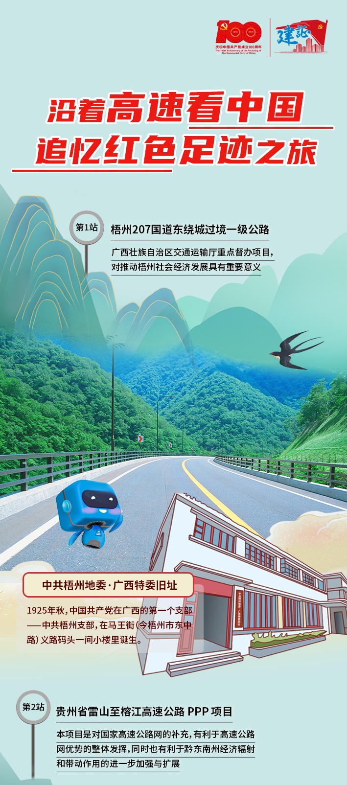 追憶紅色足跡,“建”證時代發展。多年來,中國建筑自南向北、自東向西建設了一條條承載著“紅色印記”的高速公路,這些高速公路途經西柏坡、遵義等紅色地標,搭建起“經濟動脈”,“建”證著時代發展,傳遞著永不磨滅的紅色精神。