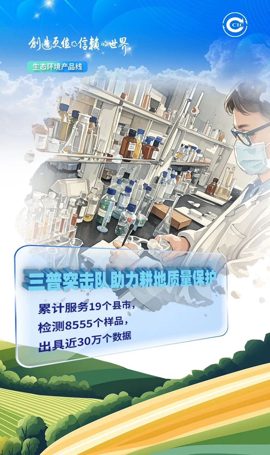 中國中檢生態環境產品線組建專項工作組,服務第三次全國土壤普查工作,累計為19個縣市提供技術支持,完成8555份土壤樣品檢測,出具檢測數據近30萬個。