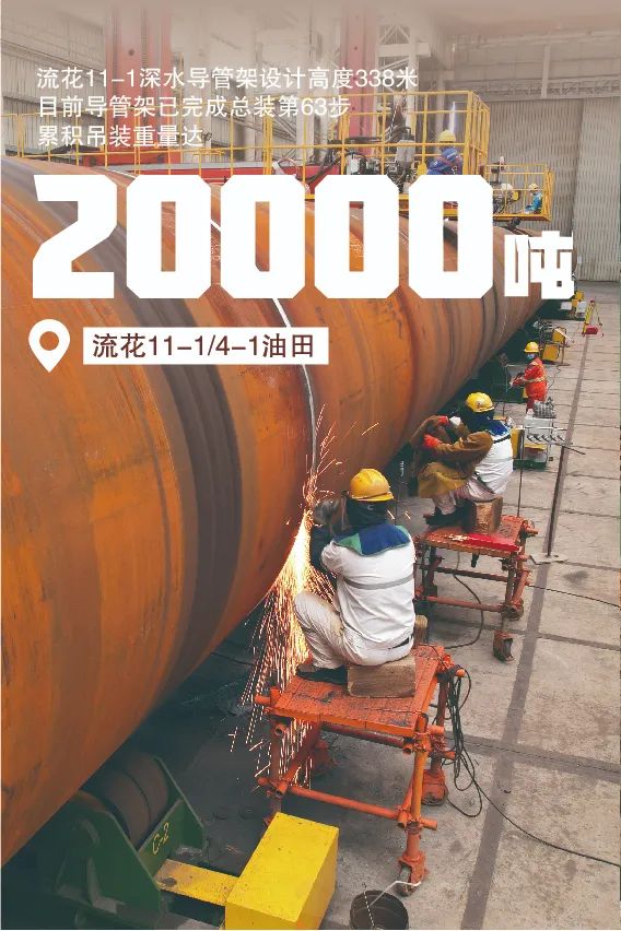 塔機高聳,導管蜿蜒,流花11-1/4-1油田二次開發項目深水導管架和圓筒型FPSO(浮式生產儲卸油裝置)在珠海和青島南北呼應,建造場地熱火朝天。其中,導管架已完成總裝第63步,累計吊裝重量達20000噸,圓筒型FPSO完成船體“雙層底”合龍,船體建造進入全面加速期。