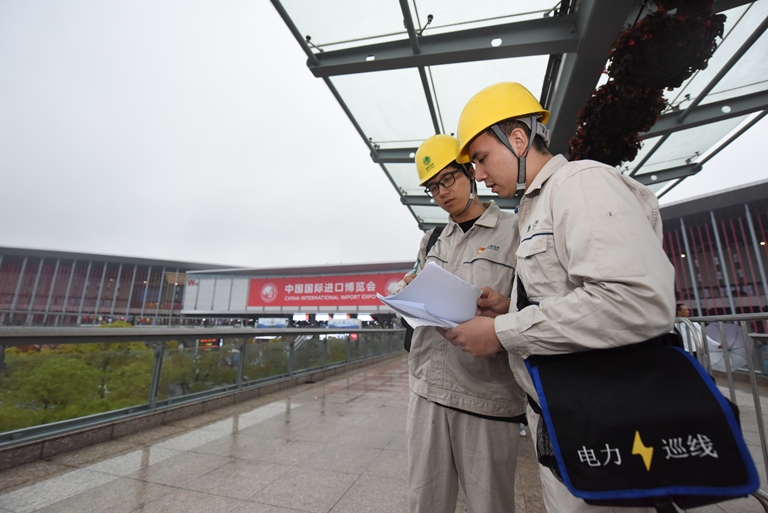 傅道峰正在與同事在進博會核心區域進行線路特巡