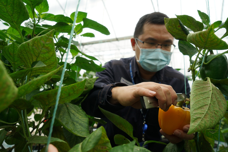 春天里,大棚里的彩椒苗比較潮濕,結出的果子質量不好,扶貧干部和村民一起,嚴把成品質量關。譚茂茜 攝