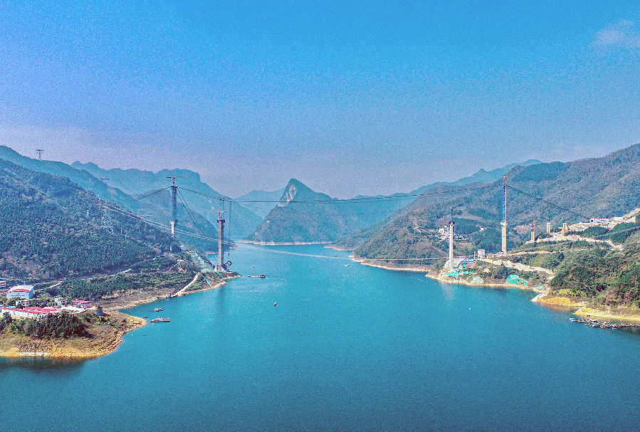 天峨龍灘特大橋位于廣西河池市天峨縣龍灘大壩上游6公里處,是南丹至天峨下老高速公路的控制性工程之一。大橋全長2488.55米,主橋為跨徑600米的上承式勁性骨架混凝土拱橋,是在建的世界最大跨徑拱橋,開創了世界600米級拱橋建設的新紀元。南丹至天峨下老高速公路主線全長104.9公里,是廣西單座公路隧道最長,世界已建或在建拱橋計算跨徑最大的項目。項目建成后,將結束天峨縣不通高速的歷史,對于高水平共建西部陸海新通道,進一步形成廣西北部地區的連接新通道,構筑起南向北聯、東融西合、出省出邊、通江達海的高速公路網絡具有重大意義。