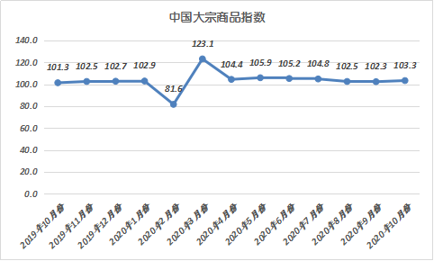 由中國物流與采購聯合會調查、發布的2020年10月份中國大宗商品指數(CBMI)為103.3%,較上月上升1.0個百分點。各分項指數中,供應指數止跌反彈、銷售指數繼續上升,庫存指數仍在下跌。從指數的變化情況來看,本月指數止跌反彈,且供需雙側聯動上升,特別是需求端回升力度強于供應端,令市場庫存壓力持續緩解,顯示在政府相關政策的持續推動下,國內經濟復蘇繼續保持向好趨勢,加之“銀十”旺季發力,大宗商品市場需求端表現較為出色,市場供需更趨均衡,整體表現符合預期。進入11月份,行業基本面會出現一定的變化,特別是北方進入冬季,需求強度會有所減弱,加之國內外宏觀經濟仍有較大的不確定性,因此,我們認為大宗商品市場將逐步進入調整期,商品價格面臨較大的沖高回落的風險。
