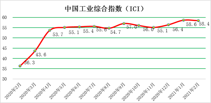 2021年2月份,中國工業綜合指數(以下簡稱ICI)為58.4%,環比下降0.2個百分點,受春節效應影響小幅回落,自去年4月份以來連續位于榮枯線以上,表明中國工業經濟總體持續恢復。生產狀況指數為66.7%,環比上漲1.3個百分點,繼續保持高位,企業生產活動積極平穩進行。效益狀況指數為52.5%,環比下降0.5個百分點,小幅回落。經營環境指數為54.5 %,環比回落0.5個百分點,在保持較高位的基礎上連續位于榮枯線之上,反映了市場經營環境持續改善。融資難易指數為47.2%,環比下降1.0個百分點,持續位于榮枯線下方,且該指數仍低于50%的均衡線,表明當前企業融資難融資貴的問題持續存在,針對此難題還需更有效的貨幣、財政政策等。預期發展指數為59.6 %,環比下降1.8個百分點,有所回落但持續位于榮枯線以上,該指數依舊長期保持高位優勢。ICI制造業指數為60.1 %,環比回落0.3個百分點,但處于高位,自去年4月份以來連續位于榮枯線以上,表明制造業總體持續回暖。