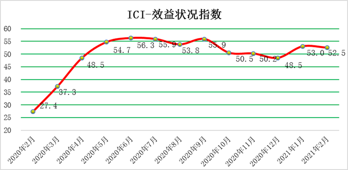 2月份,效益狀況指數為52.5 %,環比回落0.5個百分點,繼續位于榮枯線之上,效益狀況持續恢復。具體來看,利潤指數為59.9%,環比上漲1.1個百分點,企業盈利情況持續向好;成本指數為29.7%,環比下降2.4個百分點,企業在成本方面的負擔不斷加重,值得關注;產成品庫存指數為55.7%,環比下降3.5個百分點,繼續位于榮枯線之上,需求大于生產,產品庫存減少。凈資產回報率指數為57.4%,環比下降1.3個百分點,繼續位于榮枯線之上,企業凈資產持續得到改善。