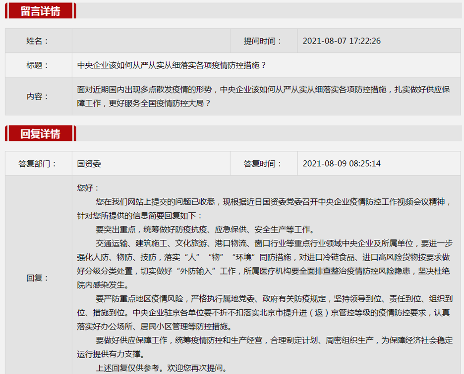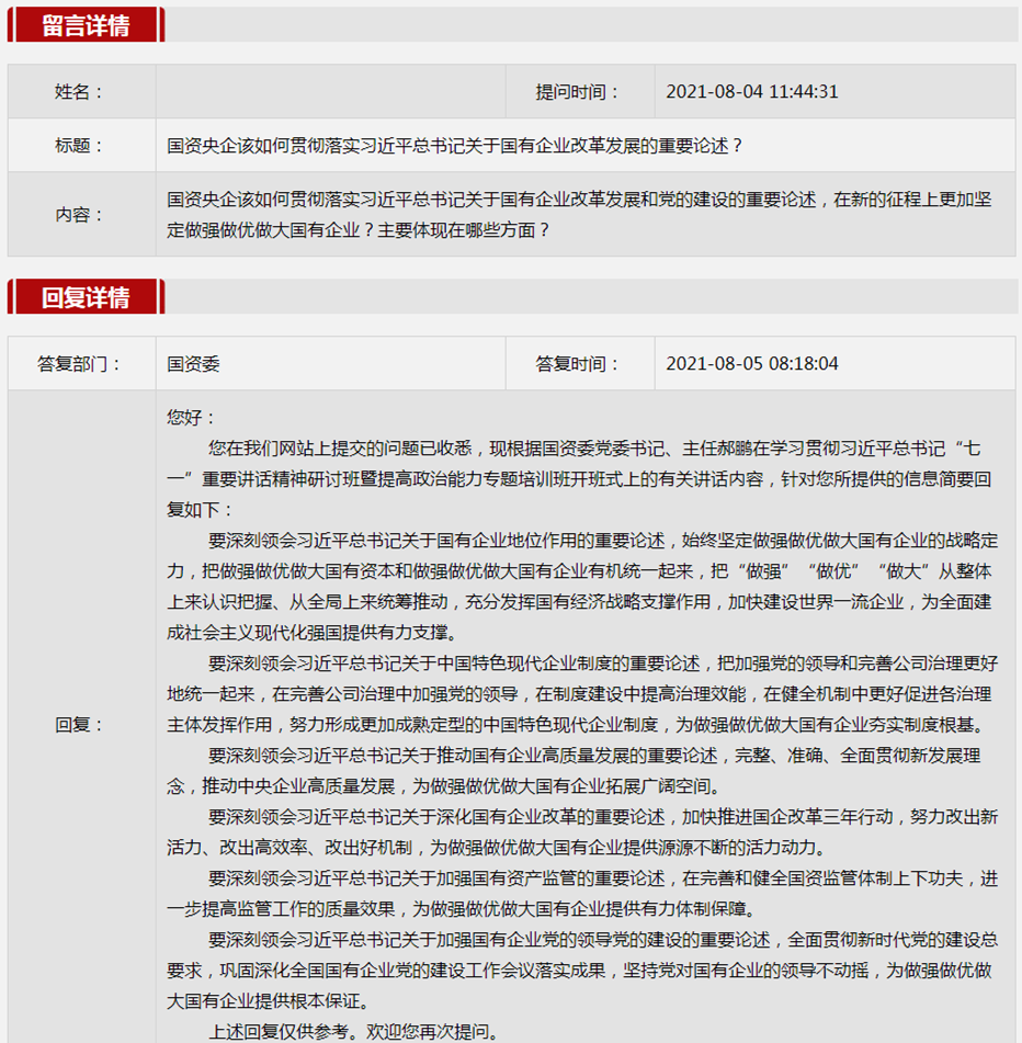 2021年8月國資委網站政務咨詢欄目部分網友提出的咨詢,我們初步做出了認真的回應,現選擇五條關注度高、點擊量高的問題,再次推薦分享。