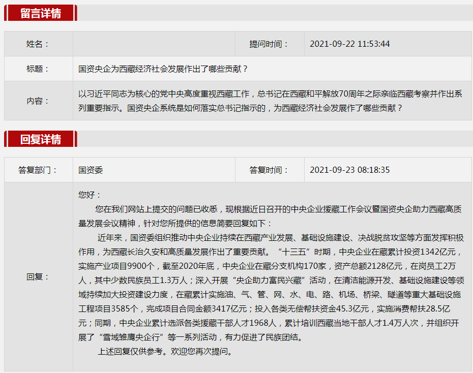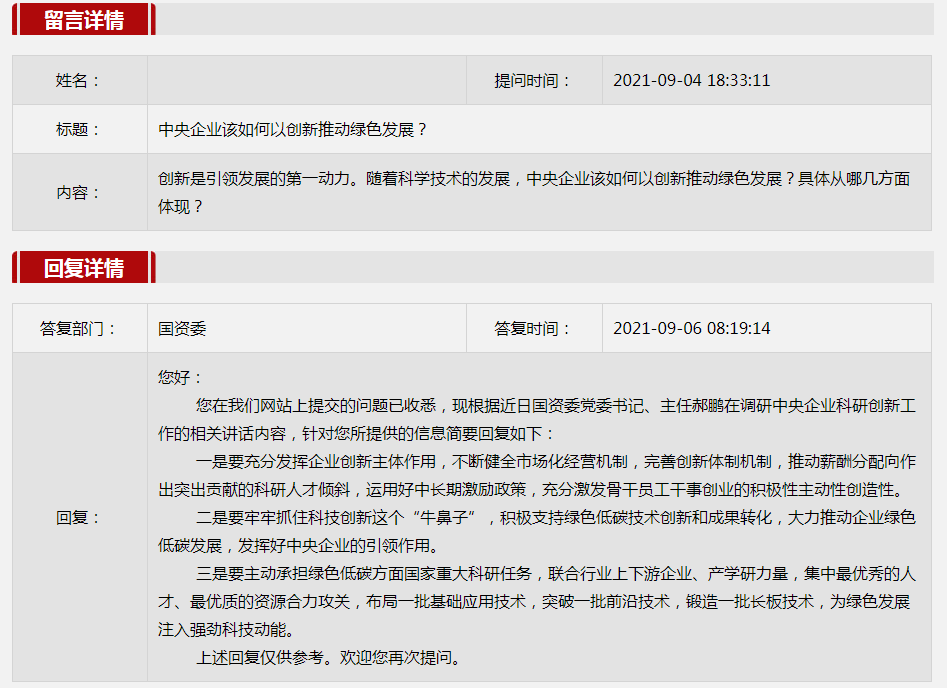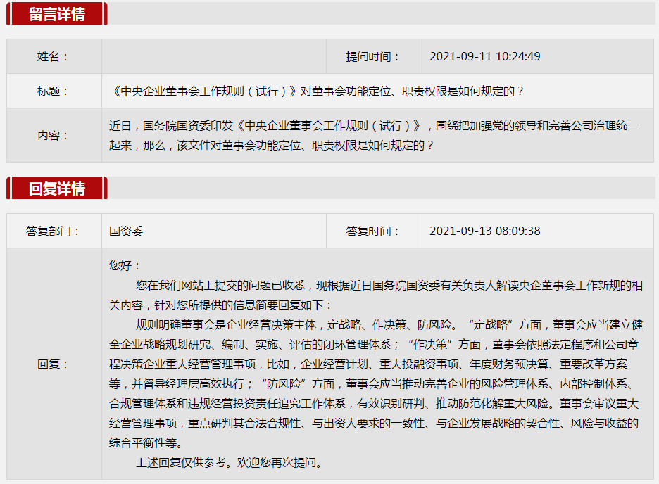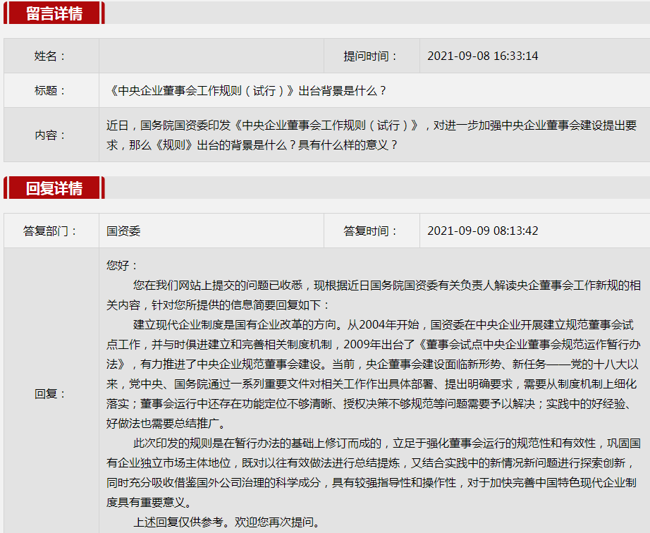 2021年9月國資委網站政務咨詢欄目部分網友提出的咨詢,我們初步做出了認真的回應,現選擇五條關注度高、點擊量高的問題,再次推薦分享。
