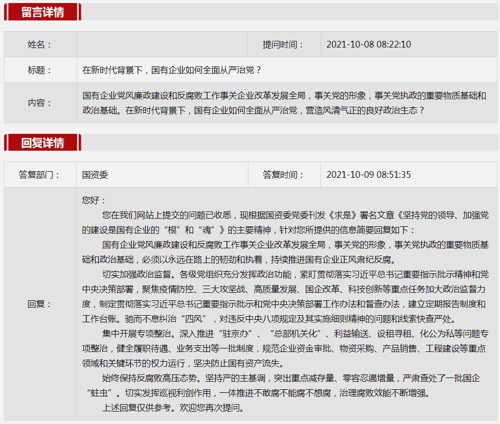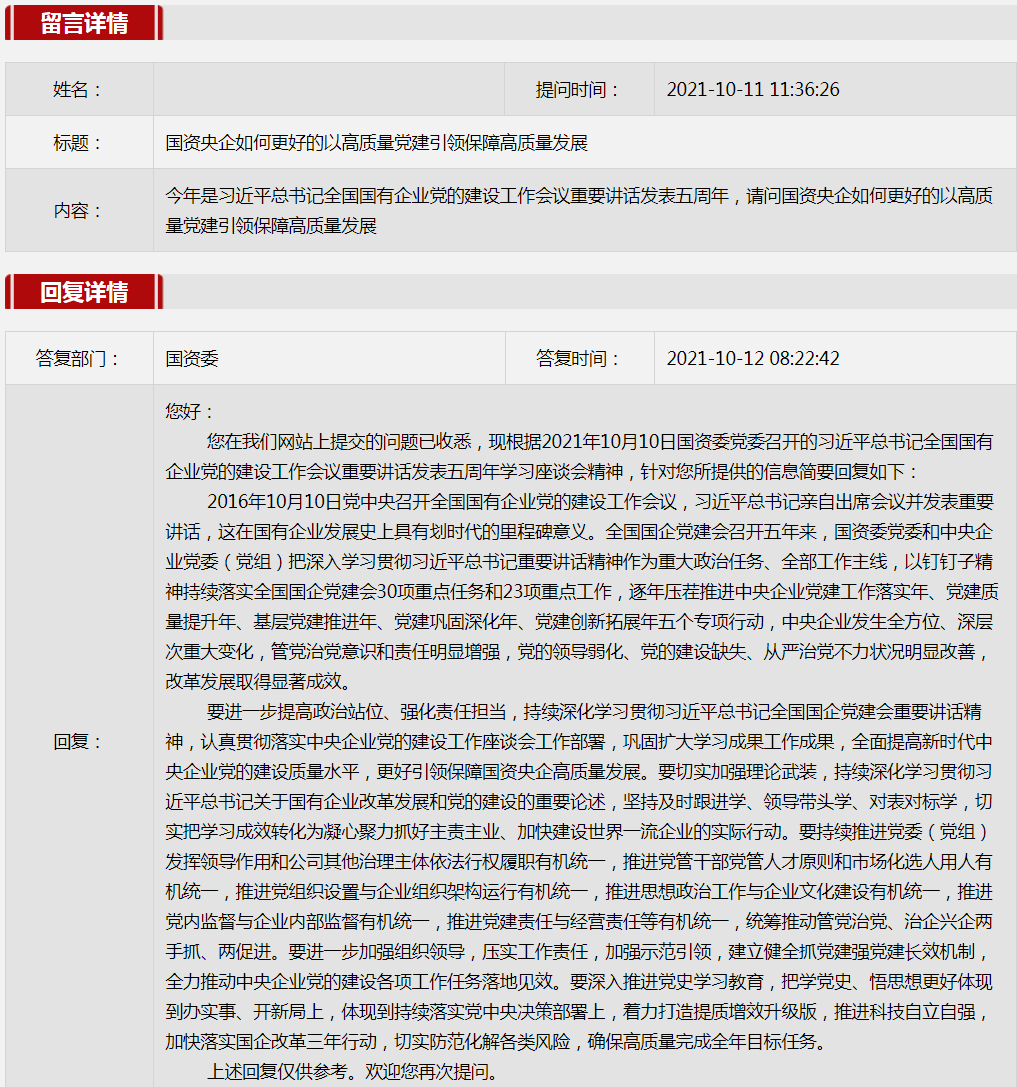2021年10月國資委網站政務咨詢欄目部分網友提出的咨詢,我們初步做出了認真的回應,現選擇五條關注度高、點擊量高的問題,再次推薦分享。