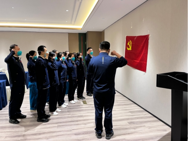 中國電建援滬醫療隊臨時黨支部重溫入黨誓詞。