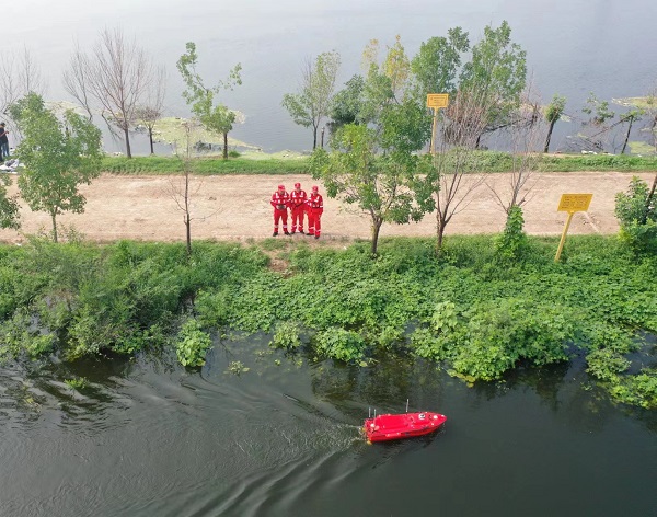 8月5日,天津靜海大清河,技術人員利用無人偵測船不間斷監測水情,探測水下地形地物,快速準確獲取水下堆體數據及模型……