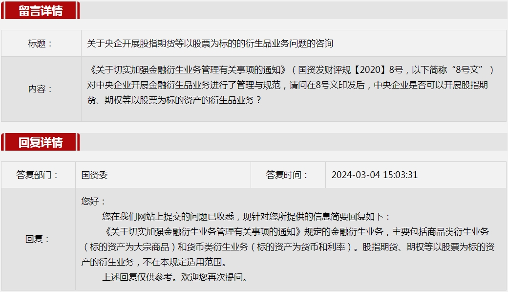 1.關于央企開展股指期貨等以股票為標的的衍生品業務問題的咨詢