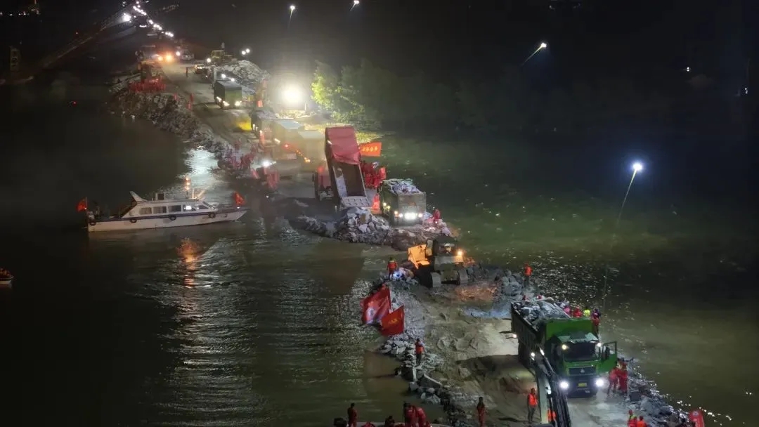 “為了加快進度,從6日晚上起,我們增加水上拋投作業,采用大型駁船運輸大塊石,并在船上布置皮帶輸送機、駁船底開口進行拋投石料,平堵戧堤?!敝袊材芗夹g專家張軒莊說。整個夜晚,工程車輛的大燈、運輸物料的卡車尾燈、大功率應急照明燈點亮了長長的大堤。