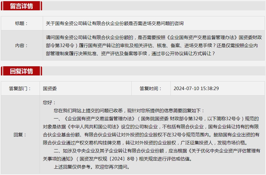 2.關(guān)于國(guó)有全資公司轉(zhuǎn)讓有限合伙企業(yè)份額是否需進(jìn)場(chǎng)交易問(wèn)題的咨詢