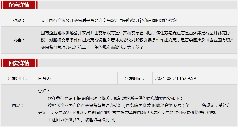 4.關(guān)于國(guó)有產(chǎn)權(quán)公開(kāi)交易后是否允許交易雙方再另行簽訂補(bǔ)充合同問(wèn)題的咨詢