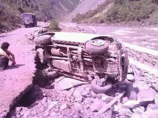我們從夾壁鄉衛生院巡查完趕去另一個工地,兩個工地之間有一段未完工的317國道路基。受地震影響,道路遭受嚴重的破壞,兩邊山上時有滾石掉下。車在顛簸、搖晃中緩慢行駛,突然,前面從山上滾下一根木頭橫在車前,瞬間車子跳起來,劇烈搖晃。我下意識抱住了頭,身體在車內左右撞擊,周圍的東西在搖晃,車在旋轉,十幾秒鐘以后,一切戛然停止。附近的工友們跑過來拉我們出去,從車子里出來后,我們發現側翻車輛離河邊只有兩米!