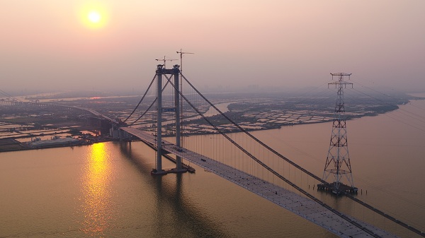 虎門二橋是連接廣州和東莞的重要過江通道,預計2019年上半年建成通車。它將和港珠澳大橋、深中通道等東西向跨海大橋一起,連接起珠江口東西兩岸的城市群?;㈤T二橋坭洲水道橋是一座雙塔雙跨的鋼箱梁懸索橋,主跨跨徑達到1688米,邊跨鋼箱梁長548米,鋼箱梁共有11類、176個吊裝梁段。坭洲水道橋由廣東長大公路工程有限公司施工。坭洲水道橋是虎門二橋的兩座主橋之一,另一座主跨1200米的主橋--大沙水道橋已于今年1月合龍。