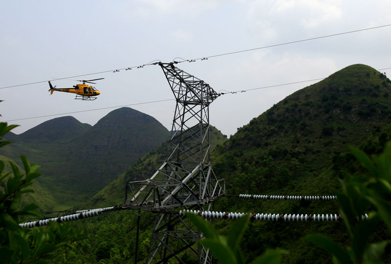 南方電網超高壓公司線路驗收人員在普僑直流輸電線路驗收過程中,在跨紅河1133米大跨越段進行高空驗收作業