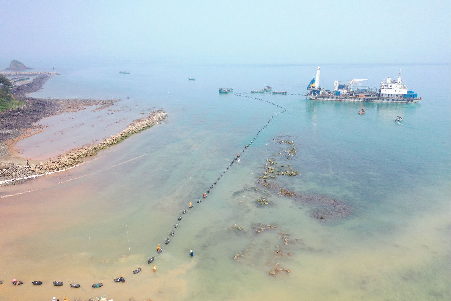 海南聯網二回工程第四根海底電纜在海南側敷設現場