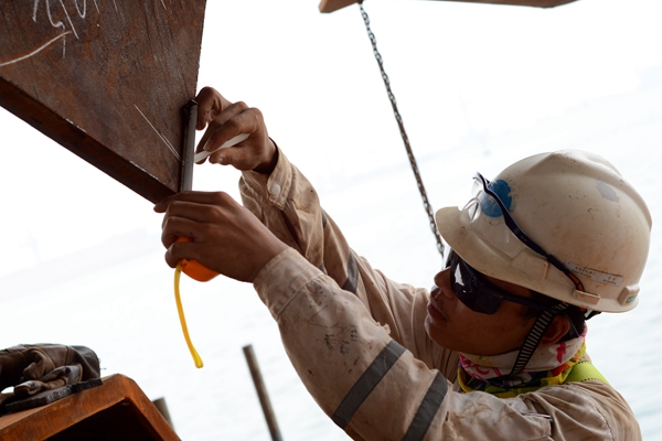 一名施工人員正在專注地進行固定拉筋的安裝尺寸測量,保證遠洋運輸安全