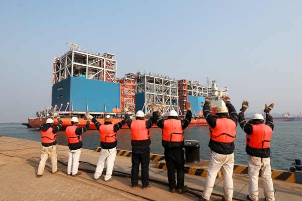 施工人員向先行裝船的模塊告別,這些模塊已經成為他們最親密的戰友