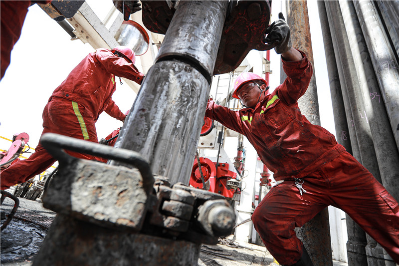中國石油西部鉆探50585隊員工進行起鉆作業,更換鉆頭