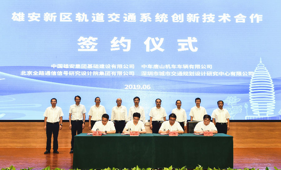 6月24日,中國通號旗下研究設計院集團與中國雄安集團基礎建設有限公司、中車唐山機車車輛有限公司、深圳市城市交通規劃設計研究中心有限公司簽署《雄安新區軌道交通系統創新技術合作協議》,共同推進雄安新區軌道交通系統創新技術合作,打造雄安智慧交通,助力京津冀協同發展。