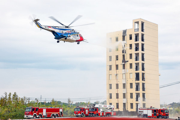 據悉,AC313直升機加裝的機腹水箱可載水4噸,水炮射距達40米,可實施側向、俯仰方向的滅火,廣泛適用于城市高層建筑、懸崖復雜地形環境、大面積火源及多火點的火災撲救工作。