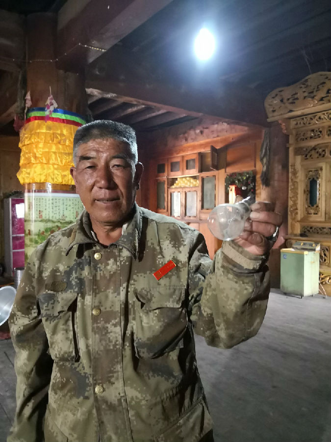 我記得電桿用的木料都是從山上用牦牛拉回來的。聽技術員說安裝好,就有電用,晚上也能跟白天一樣亮晃晃的,我們那個激動啊,沒日沒夜地挖洞、拉桿,用了六天時間就把變壓器架起來了。