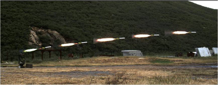 該試驗采用高低內外軌的導軌式發射方法,雙軌設計保證了彈體在離軌瞬間的穩定性,進而保證彈道飛行的穩定性。此外,采用后噴發動機設計,對飛行平臺微后坐力,可保證無人機的安全。
