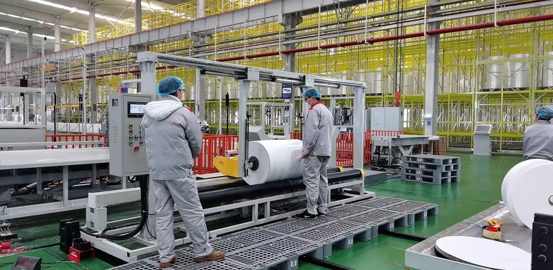 該智能化無紡布生產線首次將AGV物流系統與智能倉儲系統應用在無紡布行業,生產車間全面采用遠程調控技術進行自動化、信息化和柔性化制造,可實時監控生產數據和自動檢測產品質量,實現了無紡布從原料入庫-自動拆包-自動上線-成品布自動分切-自動包裝入庫的全流程數字化智能化生產,與傳統生產線相比,人員減少約40%,生產效率提高30%,每天生產口罩用紡粘材料10噸,可供制作防護口罩1000萬個,并且產品具有透氣、防水、無毒、無味、無菌、環保等優點。