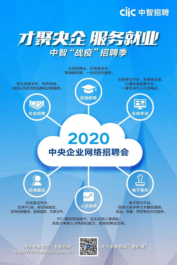 中智作為一家主營人力資源及智力服務的中央企業,為做好疫情防控下的人才招聘工作,服務穩就業、穩預期的工作大局,主動作為、充分發揮行業優勢、積極履行央企社會責任,依托自身在招聘服務方面的獨特優勢,全力跟進落實國資委提出的“保障企業用人需求、促進生產恢復、保障和改善民生、穩定就業”的有關要求,聯合全國各地知名高校和國務院國資委所屬各中央企業,舉辦“才聚央企,服務就業,中智戰疫招聘季”專項招聘活動?;顒又铝τ跒楦髦醒肫髽I提供“定制化、顆?;⒁惑w化”的全流程線上招聘服務,實現“信息發布—簡歷收集—簡歷篩選—在線筆試、在線面試、在線測評—錄用公告發布—電子簽約”的全流程線上招聘服務。線上招聘服務集成“社會招聘、校園招聘、在線考試、在線面試、人才測評、電子簽約”等模塊功能的一體化布局,使企業、求職者足不出戶即可滿足雙方的用工、求職需求。