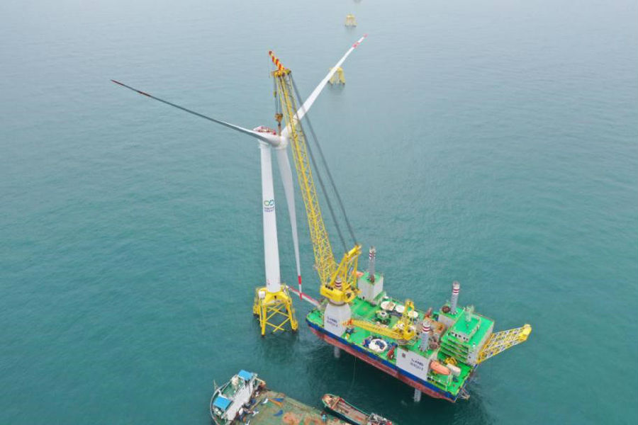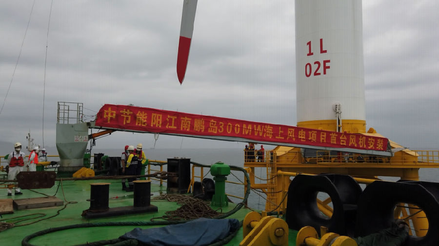 3月8日,中國節能陽江海上風電項目首臺5.5MW風機,經過13多個小時的連續激戰,成功將三支長達76米的葉片在100多米高空與風機機艙輪轂精準對接,首臺風機吊裝成功標志著中國節能風電海上項目工程建設邁出重要一步。