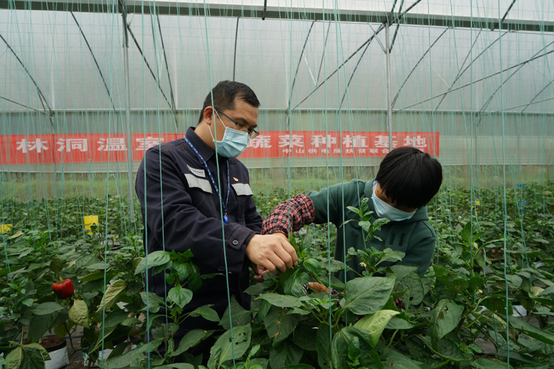疫情期間,南方電網廣東中山供電局扶貧干部高鋒,正在定點扶貧村肇慶市林洞村彩椒種植大棚內,和農戶一起檢查彩椒幼苗的生長情況。譚茂茜 攝