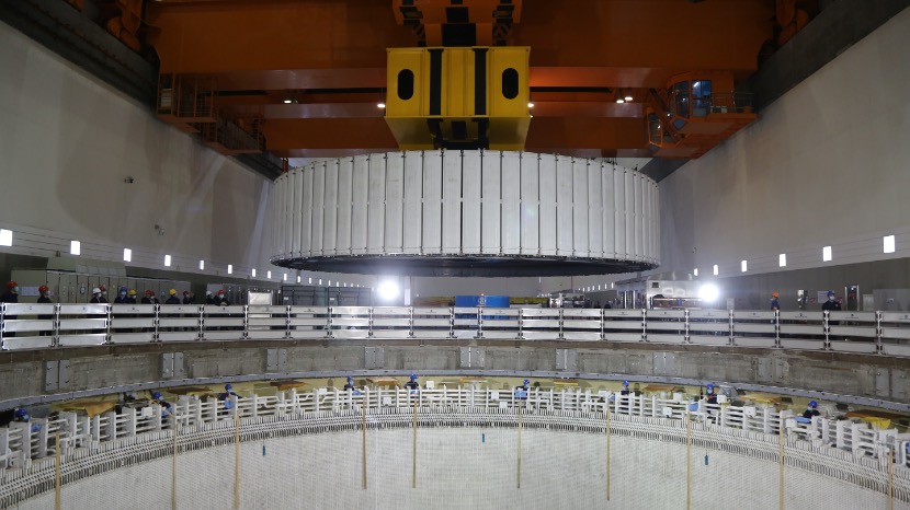 向家壩電站7號機組發電機轉子緩緩落入基坑。