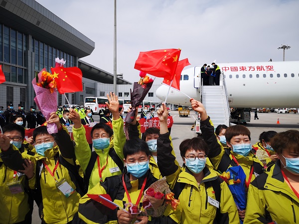3月24日15:45,當天最后一架包機MU7880落地西安咸陽機場,當177名醫護人員走下飛機時,機下的東航員工高高舉起“中國東方航空歡迎白衣天使回家”的橫幅,熱情迎接他們的凱旋歸來。