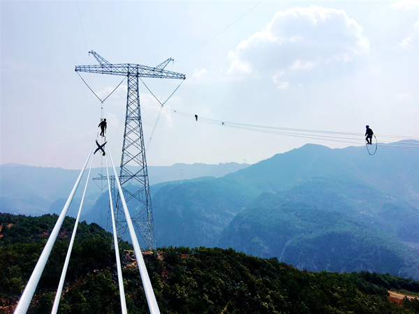 4月20日,云貴互聯通道工程直流線路全線貫通。圖為在云貴互聯工程線路3標驗收現場,南方電網超高壓公司昆明局員工正在進行高空走線驗收工作。